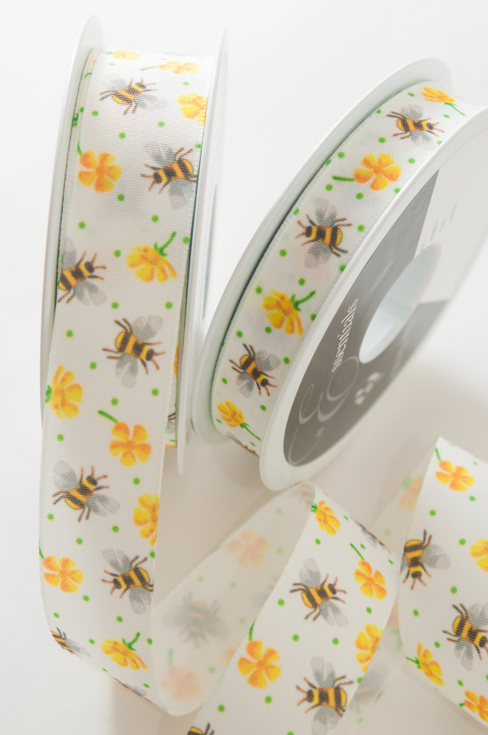 - A pretty design of busy bees and buttercups with a sweet green polka dot. Create hand tied bows for flower bouquets and springtime gifts.