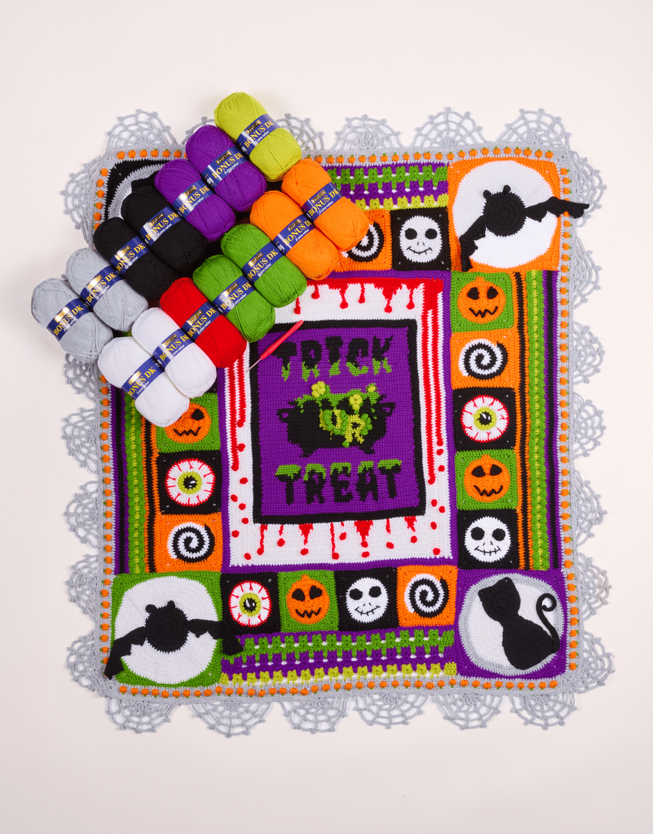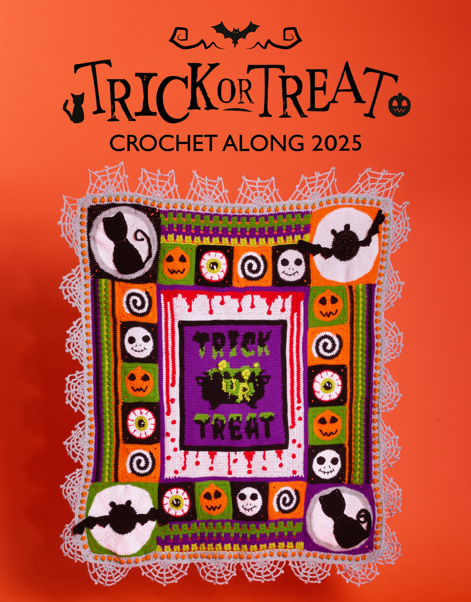 A fun Halloween Crochet Along (CAL) from Sirdar, the Trick Or Treat Crochet Along is a six-week crochet blanket project featuring all your favourite Halloween themes, from bats and cats to pumpkins and skeletons!